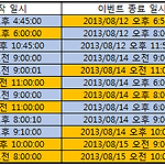 선분 이력 테이블을 작업하다 보면 겹치는 부분에 대해서 병합하고, 겹치지 않는 구간에 대해서는 그대로 남겨두는 방식을 많이 하게 됩니다. 사실 선분 이력 테이블을 제대로 관리하려면 종료 시점과 시작 시점이 끊어지지 않게 상호 관리하는 것이 바람직하지만, 보편적으로 관리의 어려움이 있다 보니 여러 데이터를 쌓아 놓고 비지니스 로직(SQL)로 해결 하는 경우가 많을 것입니다. 1. 선분이력 데이터 보기 아래는 사용자 별로 이벤트 시작 일시와 이벤트 종료 일시에 대해서 표로 작성했습니다. 파란색 부분은 병합이 되지 않는 구간이고, 노란색 부분은 병합이 되는 부분입니다. 병합 그룹 번호를 부여한 이유는 이벤트 시작 일시과 이벤트 종료 일시를 연결하고자 하는 것입니다. 즉, 2013/08/12 오후 4:45:00..